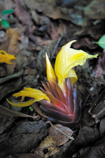 蘘荷在江南分布广泛,为多年生草本,其枝叶类似生姜,长大后植株高可达50~100厘米,喜欢生于阴湿山谷的林下。它有一个与众不同也非常奇特之处,那就是花会长在根部。初秋时分,蘘荷有如竹笋模样的花苞会从土里钻出。盛开时花从“竹笋”顶端爆出,花柄很长,花朵大而透明,花冠白色或淡黄色,十分明丽动人。到冬天蒴果慢慢长成,待叶子完全枯萎后开裂为三瓣,最后露出那些让人心悸的黑色果实。