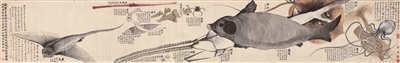 章拒:《异鱼图》中刻画得极具动感,题识:“大者名石拒,又名章举、章锯、射踏子,总称章鱼。八足,中二足最长,足上密缀肉如臼,臼吸物绝有力……中无骨,与乌鲗异。”这里的“章拒”应指章鱼。很多人分不清楚章鱼、墨鱼和鱿鱼。虽然这三者同属于头足纲,但章鱼属于八腕目,乌贼和鱿鱼属于十腕目;而乌贼和鱿鱼又因内壳、身体形态等差异,分属不同的科。