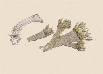 沙噀:即海葵。在温州话里,“噀”(xùn)音“蒜”,因为其形状像蒜头,字生僻,所以在永强等地也被称为“沙蒜”。“噀”字在古汉语中义为“口中喷水”,正是其在泥沙中常见的动态。图中沙噀的题识记载:“形如牛马,藏头,长短视水浅深,以须浮水面,吸食鱼虾,出水即缩,无目无皮,骨有知觉。”