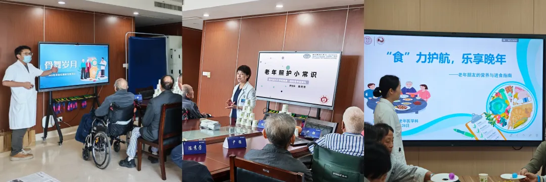活动期间,各院区老年医学科开展了专业实用的健康讲座。南白象院区尹强主治医师带来《骨质疏松防治知识—骨舞岁月》专题讲座,以通俗语言解析防治要点;陈秀芳护士长则围绕《老年照护小常识》,悉心讲解老年人日常健康管理的核心知识。公园路院区饶丽丽护士主讲《"食"力护航,乐享晚年》,通过生动案例传授科学的自我营养管理方法。