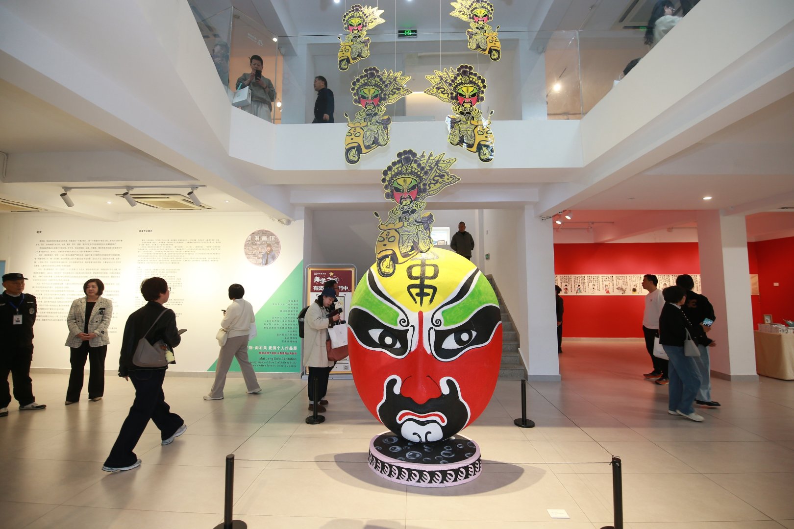步入美术馆一楼,大型装置作品《廖化冲冲冲》率先闯入视线。红黄绿三色的京剧脸谱装置之上,廖化骑着小电驴风风火火向前冲,形象宛如当代“外卖小哥”。麦浪说:“选择廖化,一是因为他从三国开篇出场直至晚期,像一位贯穿全程的‘常青树’;二来老话讲‘蜀中无大将,廖化作先锋’,我也希望做艺术里敢闯敢试的先锋者。”